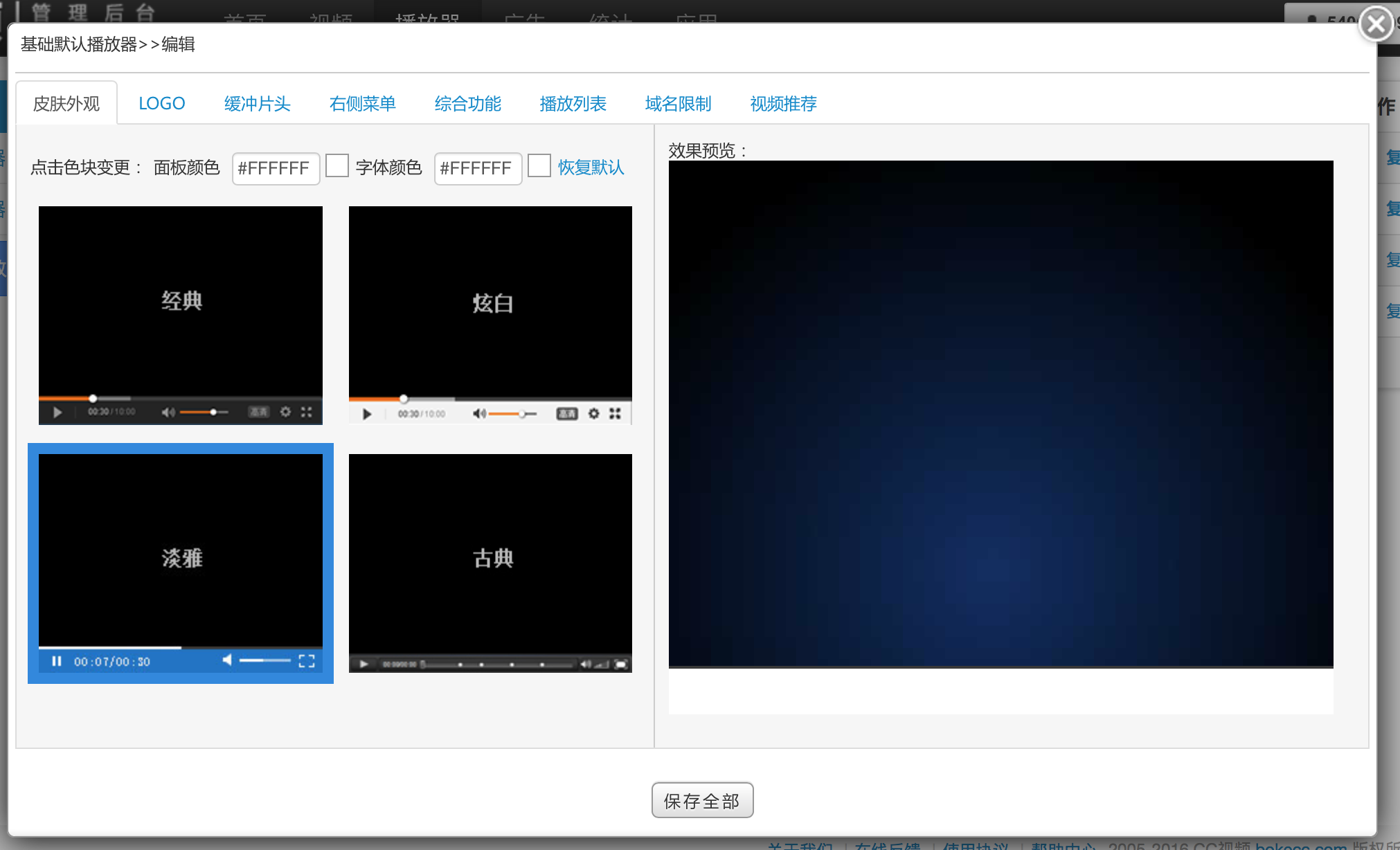 进入具体播放器编辑页面,点击皮肤外观标签,设置播放器皮肤外观。